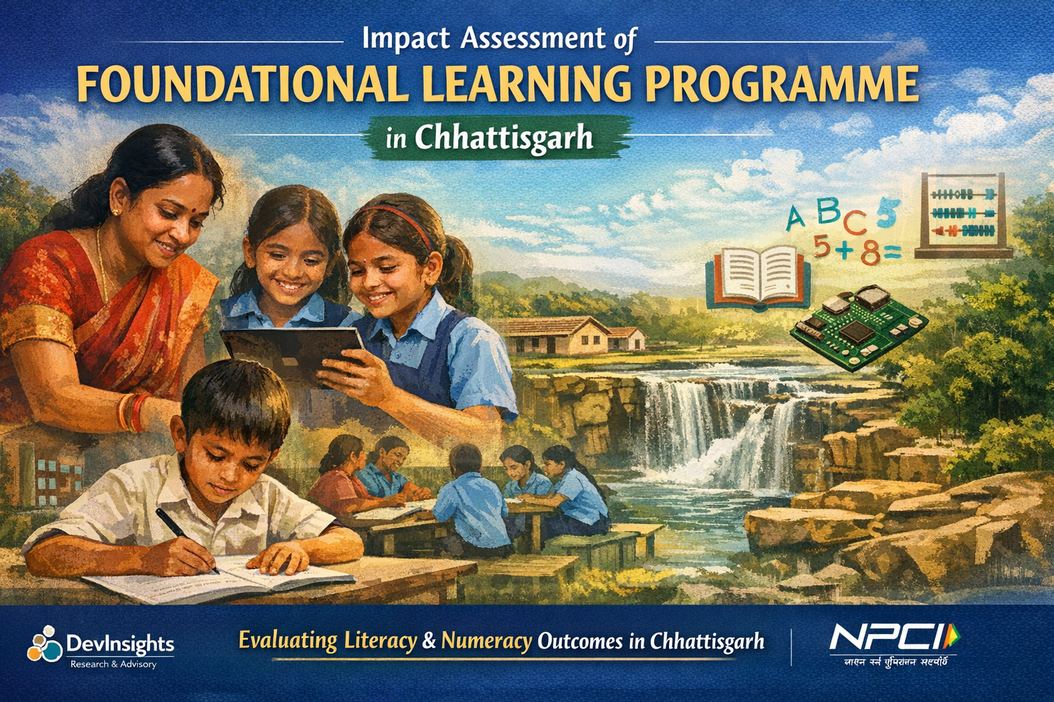 DevInsights conducted an impact assessment of the Foundational Learning Programme (FLP), implemented by Pratham Education Foundation with support from NPCI, aimed at strengthening literacy and numeracy skills among children across 430 villages in Kanker district, Chhattisgarh. The programme adopts a multi-pronged approach including learning camps, school-basedsupport, digital learning tools, and community engagement to address learninggaps, particularly in the post-COVID context.